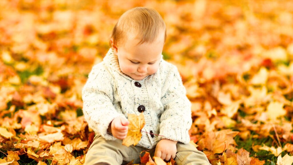 Снимка сред листата — боси крачета, малки ръчички, които държат жълто листо.